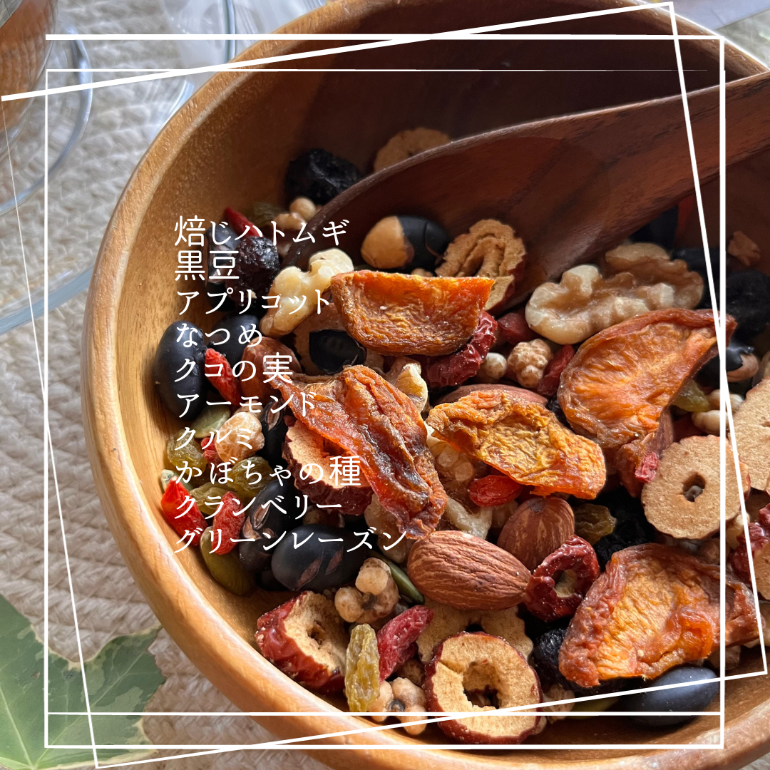 黒豆・焙じハトムギ・桑の実・くこの実・なつめチップ・くるみ・黒糖・カシューナッツ・松の実・レーズン・クランベリー